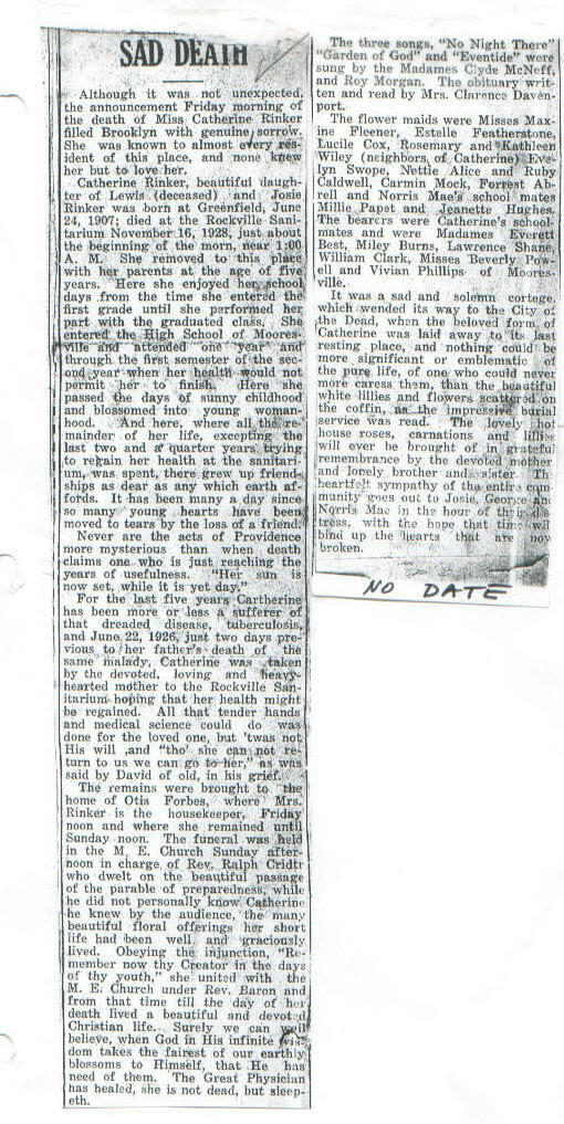 Other Age 21. Funeral at M.E. church. Parents: Lewis (deceased) and Josie Rinker. Spent freshman and part of sophomore year at Mooresville HS, until she became too ill. Housekeeper for Otis Forbes. Died of tuberculosis at Rockville Sanitarium for TB.