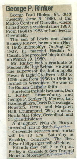 | Other | Age 84. Carlisle graveside services and burial at Brooklyn cemetery (Rev. Edward Ripperger.) Died Medco Center, Danville. Parents: Lewis and Josie Beasley Rinker. Graduate Mooresville HS. |