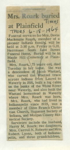 | Other | Age 75. Buried Maple Hill cemetery at Plainfield. Born in Whetzel homestead at Waverly. Descendant of Jacob Whetzel of the Whetzel Trace. Lived in Indianapolis since 1929. |