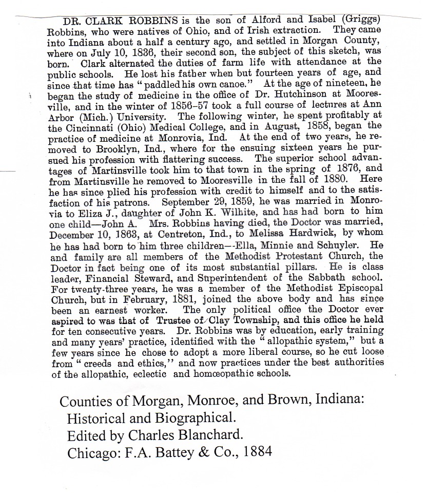 | Other | Age 68 years, 11 months, 17 days. Born on a farm in Clay Twp., Morgan Co., Ind. Parents: Alford and Isabel Griggs Robbins. Married Eliza Jane Wilhite on Sept. 29, 1859; they had one child, John A. [Note: Tombstone reads died Jan. 27, 1905.] Buried in family plot, Mooresville Cemetery. Died at home. Preceded in death by first wife, daughter Ella (who died 18 years ago), and mother, who died only a few days ago. |
