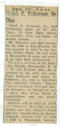 | Survived By | Widow; 2 sons, Ralph E., Jr. and Wade Roberson; daughter, Mrs. Howard (Joyce) Ringer; 2 brothers, Alva and Harold Roberson; sister, Mrs. Helen Myers; 8 grandchildren; 1 great-grandchild. |