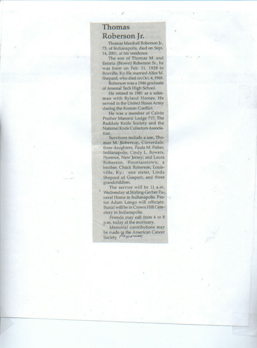 | Other | Preceded in death by spouse; parents, Thomas M. and Estoria (Brown) Roberson, Sr. U.S. Army veteran, Korean War. |
