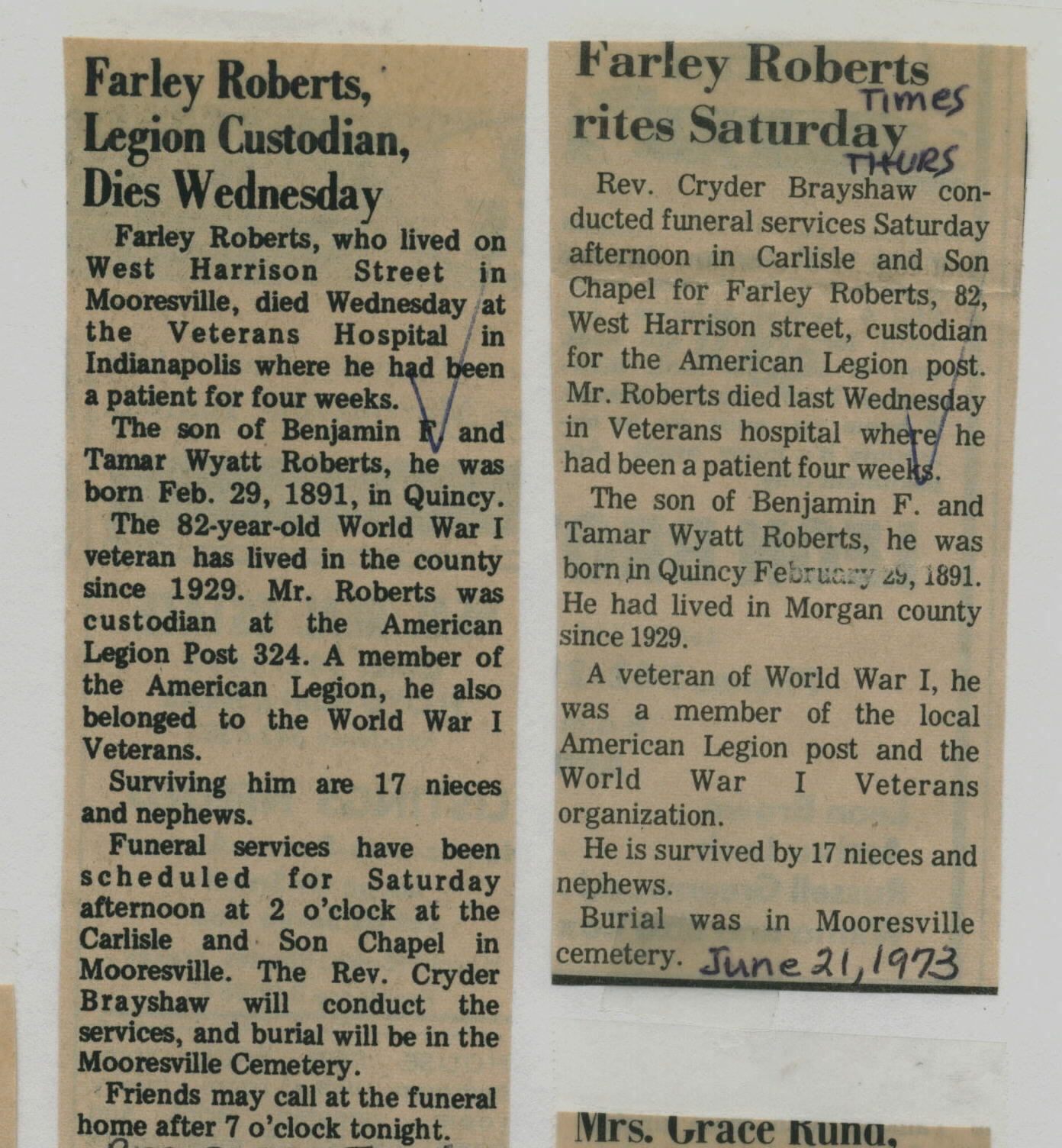 | Other | Age 82. US Army veteran of WW I. Carlisle Chapel; Mooresville Cemetery. |