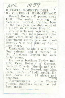 | Survived By | Brothers, Farley, Price, and Hensley Roberts; sisters, Mrs. Clark Record and Mrs. Hazel Scotten. |
