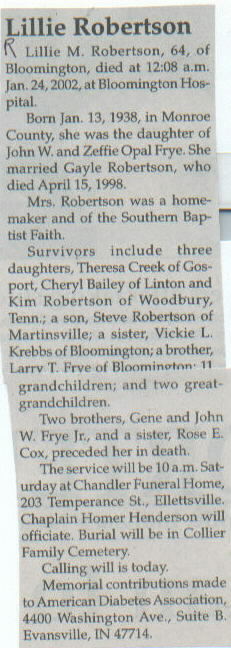 | Survived By | Three daughters, Theresa Creek, Cheryl Bailey, and Kim Robertson; son, Steve Robertson; sister, Vickie L. Krebbs; brother, Larry T. Frye; 11 grandchildren; 2 great-grandchildren. |