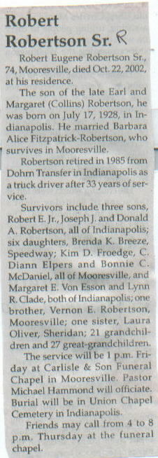 Survived By Widow; 3 sons, Robert E., Jr., Joseph J., and Donald A. Robertson; 6 daughters, Brenda K. Breeze, Kim D. Froedge, C. Diann Elpers, Bonnie C. McDaniel, Margaret E. Von Esson, and Lynn R. Clade; one brother, Vernon E. Robertson; one sister, Laura Oliver; 21 grandchildren; 27 great-grandchildren.