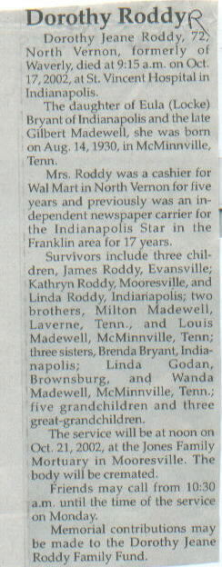 | Survived By | Three children, James, Kathryn, and Linda Roddy; 2 brothers, Milton and Louis Madewell; 3 sisters, Brenda Bryand, Linda Godan, and Wanda Madewell; 5 grandchildren; 3 great-grandchildren. |