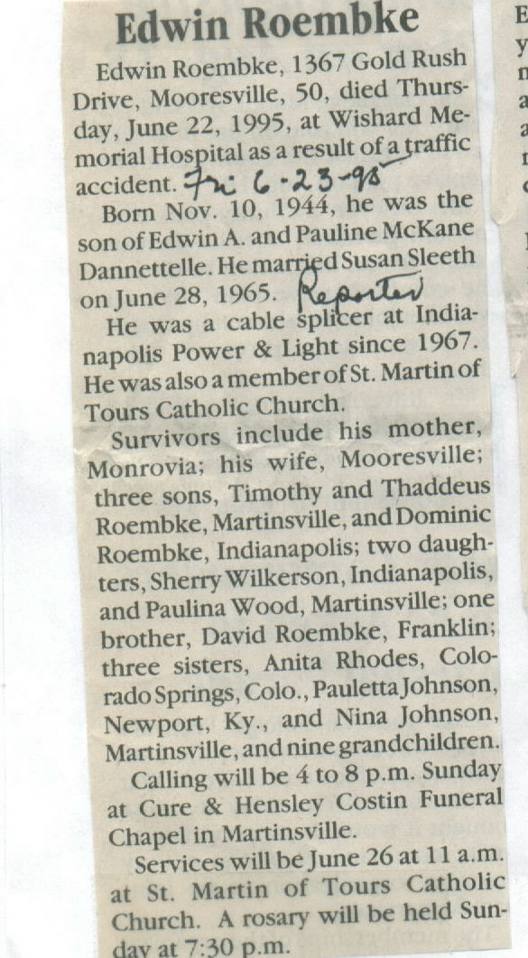 | Other | Age 50. Funeral at St. Martin of Tours Catholic Church, Martinsville. Buried in church cemetery. Parents: Edwin A. Roembke and Pauline McKane Dannettelle Danner. |