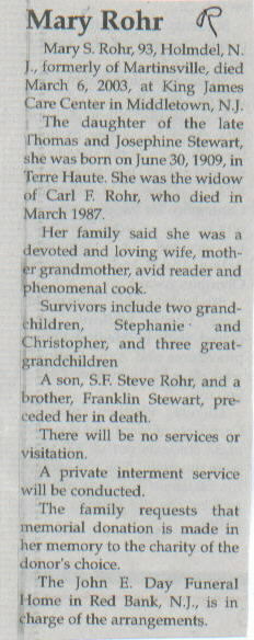 Other Daughter of the late Thomas and Josephine Stewart, she was born in Terre Haute. A son, S. F. Steve Rohr, and a brother, Franklin Stewart, preceded her in death. Died at King James Care Center in Middletown, N.J.