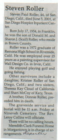 | Survived By | Parents, Donald M. and Sharon J. (Scalf) Roller; daughter, Kristen Roller; sisters, Theresa Kay Cloud and Shari McCoy. |