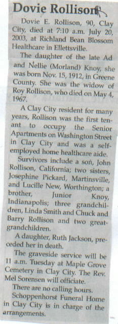 | Other | Daughter of the late Ad and Nellie (Morland) Knoy, she was born in Greene County. A daughter, Ruth Jackson, preceded her in death. |