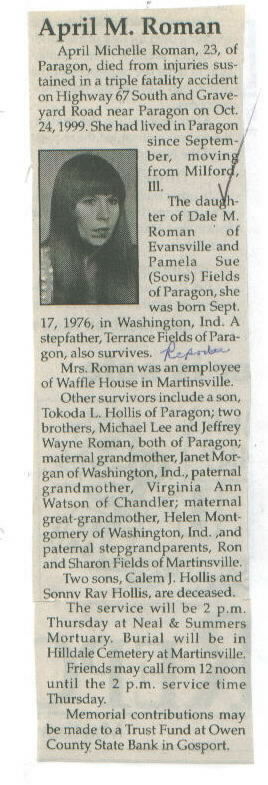 | Survived By | Parents, Dale M. Roman of Evansville and Pamela Sue (Sours) Fields of Paragon; stepfather; son, Tokoda L. Hollis; 2 brothers; grandparents. |