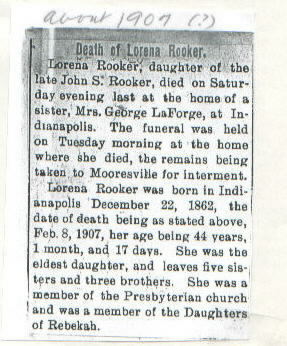 | Other | Age 44 years, 1 month, and 17 days. Daughter of the late John S. Rooker. Buried Mooresville Cemetery. Died in Indianapolis, at the home of her sister, Mrs. George LaForge. Born in Indianapolis. |
