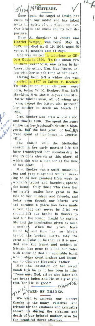 | Other | Age 66 years, 11 months, and 11 days. Parents: James and Harriet Wright. Lived in Monrovia but spent her last year in Mooresville. Preceded in death by daughter, Mrs. Hattie Smitherman, who died in 1908. |