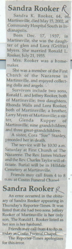 | Survived By | Spouse; son, Jeffrey Rooker; 2 daughters, Rhonda Walls and Lora Rooker; brother, Larry Myers; sister, Glenda Kupper; 9 grandchildren; 3 great-grandchildren. |