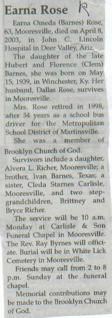 | Survived By | Spouse; daughter, Alvera L. Richer; brother, Ivan Barnes; sister, Cleda Starnes Carlisle; 2 stepgrandchildren, Brittney and Bryce Richer. |