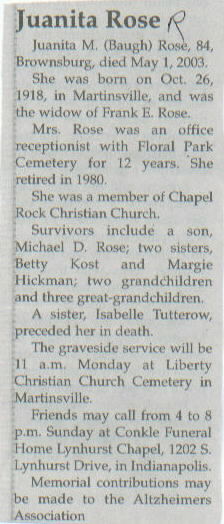 | Survived By | Son, Michael D. Rose; 2 sisters, Betty Kost and Margie Hickman; 2 grandchildren; 3 great-grandchildren. |