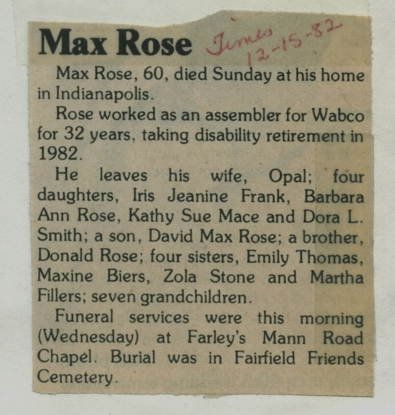| Survived By | Wife, Opal; daughters, Iris Jeanine Frank, Barbara Ann Rose, Kathy Sue Mace, and Dora L. Smith; son, David Max Rose; brother, Donald Rose; sisters, Emily Thomas, Maxine Biers, Zola Stone, and Martha Fillers. |