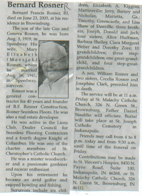 | Other | Son of the late Gus and Geneva Rosner, he was born in Speedway. A son, William Rosner, and two sisters, Cecelia Rosner and Josephine Clark, preceded him in death. |