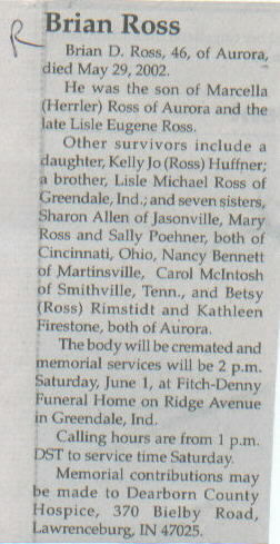 | Survived By | Mother, Marcella (Herrler) Ross; daughter, Kelly Jo (Ross) Huffner; brother, Lisle Michael Ross; 7 sisters, Sharon Allen, Mary Ross, Sally Poehner, Nancy Bennett, Carol McIntosh, Betsy (Ross) Rimstidt, and Kathleen Firestone. |