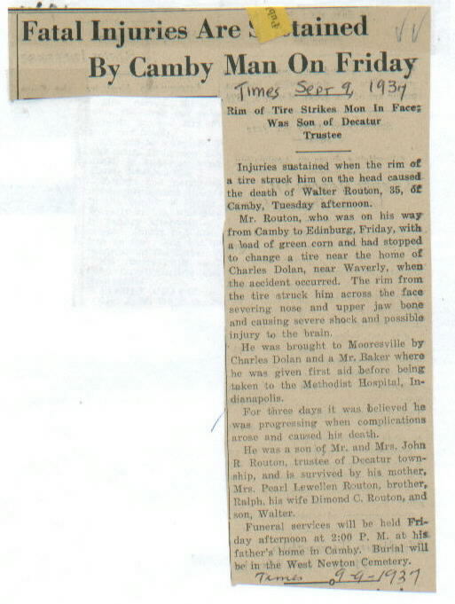 | Other | Died in hospital (Sept. 1937) after being injured when a tire he was changing struck him in the face, severing his nose and upper jawbone, causing severe shock and possible brain injury. (Mooresville Times "25 Years Ago", Sept. 6, 1962.) Parents: John J. and Pearl Routon. |