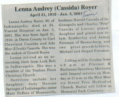| Other | Preceded in death by spouse; parents, Carl Cleveland and Ada Mae (Ulrich) Cassida. |