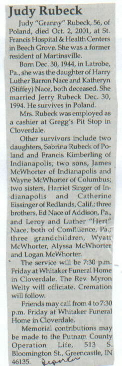 | Survived By | Spouse; daughters, Sabrina Rubeck and Francis Kimberling; sons, James and Wayne McWhorter; sisters, Harriet Singer and Catherine Eissinger; brothers, Ed, Leroy, and Luther Nace; 3 grandchildren. |