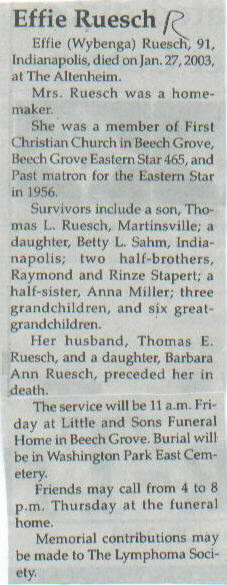 Survived By Son, Thomas L. Ruesch; daughter, Betty L. Sahm; 2 half brothers, Raymond and Rinze Stapert; half sister, Anna Miller; 3 grandchildren; 6 great-grandchildren.