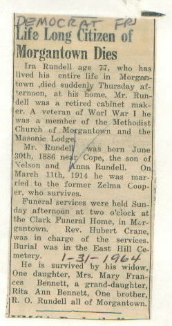 | Other | Funeral at Clark Funeral Home, Morgantown (Rev. Hubert Crane.) Buried East Hill cemetery. Retired cabinet maker. Veteran World War I. Parents: Nelson and Anna Rundell. |