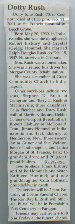 | Survived By | Spouse; sons, Stephen D. and Terry L. Rush; daughters, Celia Fletcher, Tracy Rush, and Debbie Connor; brothers, Robert and Jack Elsbury, and Jimmy Hommel; sisters, Anita Griner, Sue Weldon, and Janice Morgan; 16 grandchildren; 20 great-grandchildren. |