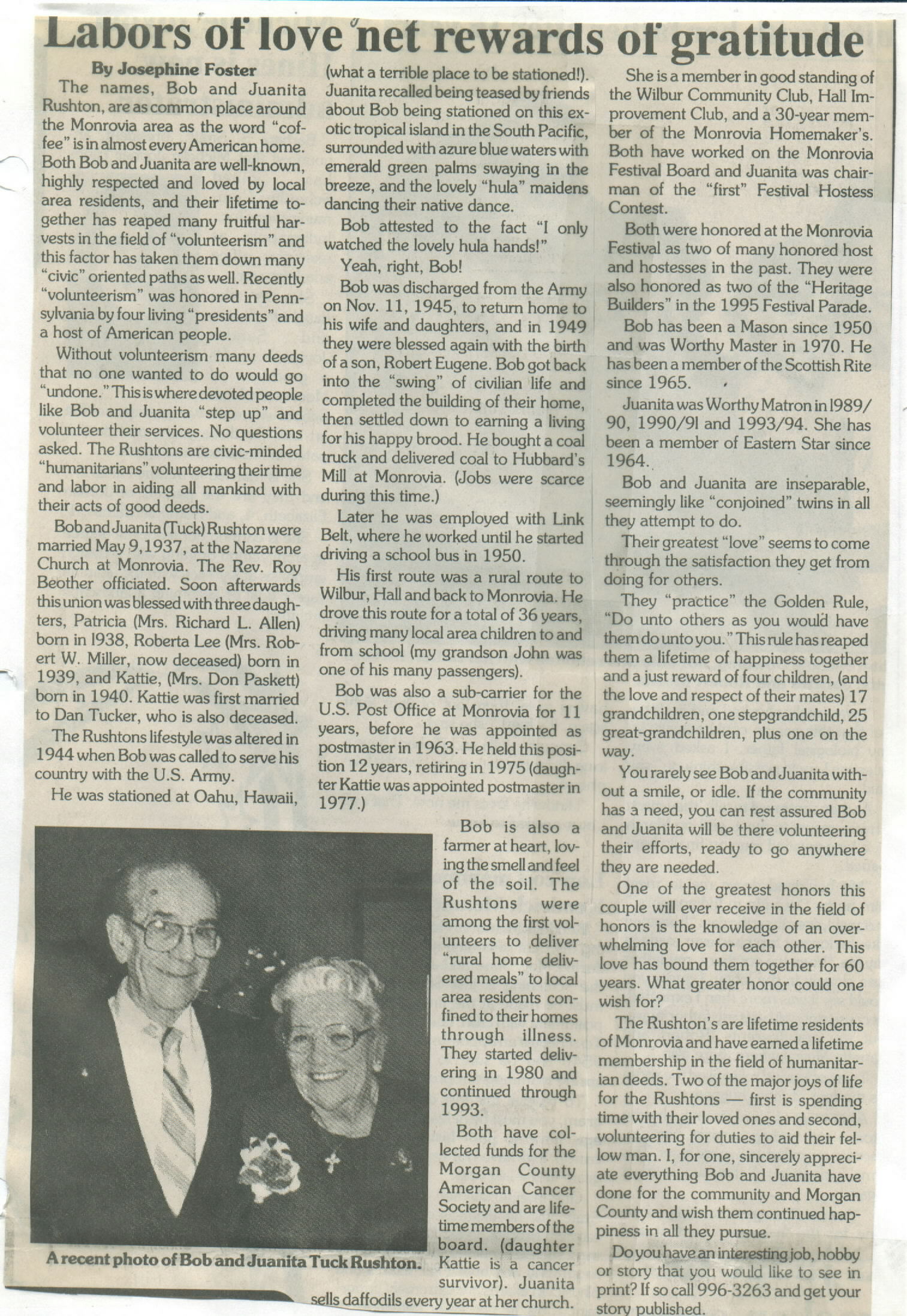 Other Age 78. Jones Mortuary. Buried Mt. Pleasant cemetery at Hall. Graduate Monrovia HS 1937. Postmaster at Monrovia 20 years. Farmer and school bus driver 37 years. Parents: Harry H. and Alice Elizabeth Hadley Rushton.