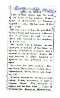 | Other | Age 75. Harvey Funeral (Rev. Glen Tudor officiating.) Buried Martinsville. Retired railroad conductor. Parents: John Henry and Mollie Olleman Rusie. |