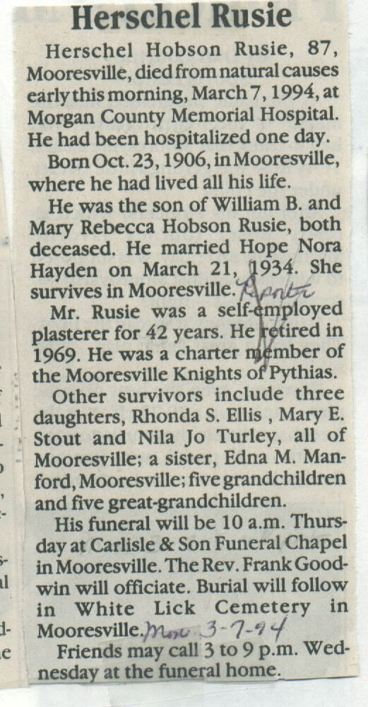 | Survived By | Widow; 3 daughters, Rhonda S. Ellis, Mary E. Stout, and Nila Jo Turley; sister, Edna (Mrs. Ray) Manford; 5 grandchildren; 5 great-grandchildren. (A sister, Mildred Rusie Shuler, and a brother, William Bill Rusie, are deceased.) |