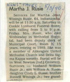 | Survived By | Husband; son, William A. Rusie; daughter, Cindy L. Busse; brother, Russell J. Winings, Jr.; 2 grandchildren. |