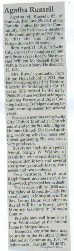 | Other | Age 85. Preceded in death by spouse; parents, John and Susie (Frye) Roach; brothers, Lloyd and Ralph Roach; sister, Alice Hopwood. |