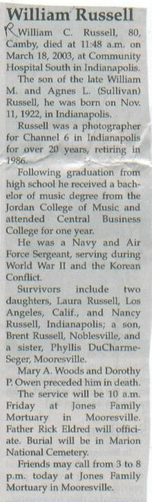| Other | Son of the late William M. and Agnes L. (Sullivan) Russell, he was born in Indianapolis. US Navy and Air Force Sergeant, serving during WW II and the Korean War. |