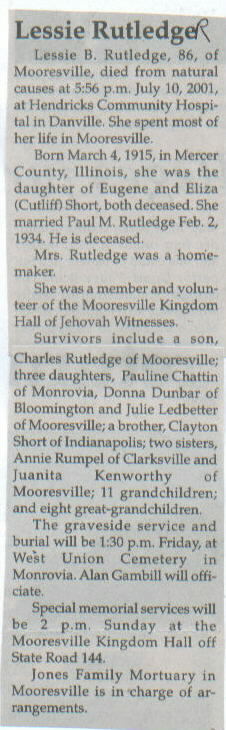 | Survived By | Son, Charles Rutledge; daughters, Donna Dunbar, Julie Ledbetter, and Pauline Chattin; brother, Clayton Short; sisters, Annie Rumpel and Juanita Kenworthy; 11 grandchildren; 8 great-grandchildren. |