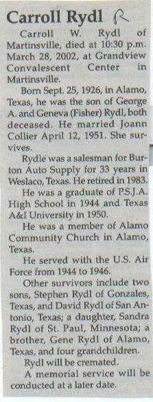 | Survived By | Widow; 2 sons, Stephen and David Rydl; daughter, Sandra Rydl; brother, Gene Rydl; 4 grandchildren. |
