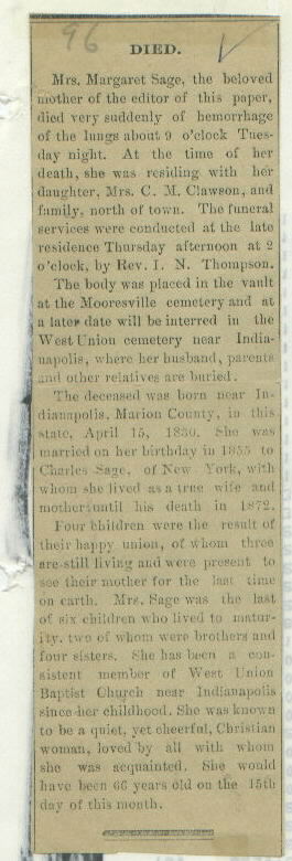 | Other | Age 66. Married Charles Sage of New York on her birthday in 1855. Died suddenly of hemorrhage of the lungs. Funeral at the residence (Rev. I. N. Thompson.) Placed in vault at Mooresville Cemetery, and later buried in West Union Cemetery near Indianapolis, where husband and parents are buried. |