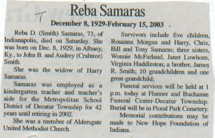| Survived By | Five children, Rosanna Morgan and Harry, Chris, Bill, and Tony Samaras; 3 sisters, Bonnie McFarland, Janet Lowhorn, and Virginia Huddleston; brother, James R. Smith; 10 grandchildren; one great-grandchild. |