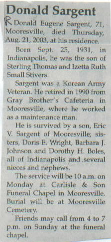 Survived By Son, Eric V. Sargent; sisters, Doris E. Wright, Barbara J. Johnson, and Dorothy H. Boles; several nieces and nephews.