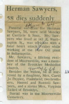 | Survived By | Widow; daughter, Mrs. Carol Jo Pepper; 2 brothers, Hansel and Russell Dean Sawyers; sister, Virginia Sickel. |