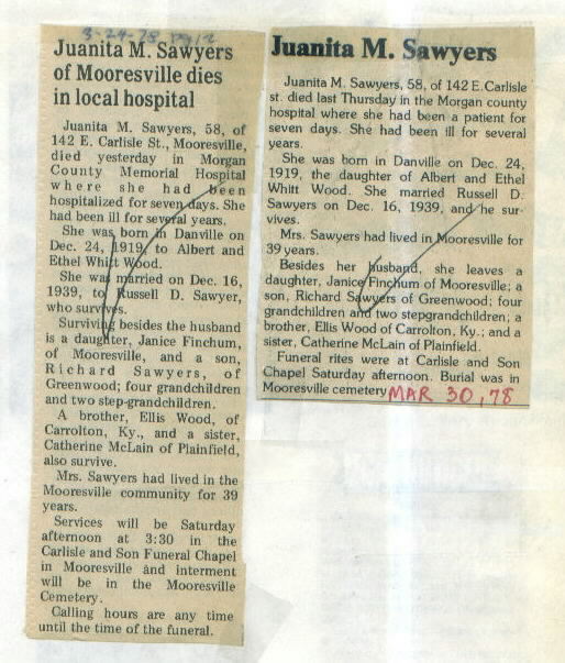 | Other | Age 58. Buried Mooresville Cemetery. Parents: Albert and Ethel Whitt Wood. Died in Morgan Co. hospital; born at Danville, Ind. |