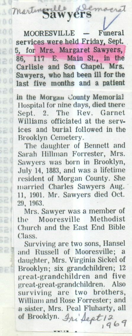 | Survived By | 2 sons, Hansel and Russell Dean Sawyers; daughter, Virginia Sickel; 6 grandchildren; 12 great-grandchildren; 5 great-great-grandchildren; 2 brothers, William and Ross Forrester; Mrs. Pearl Fluharty. (A son, Herman Sawyers, died in 1964.) |