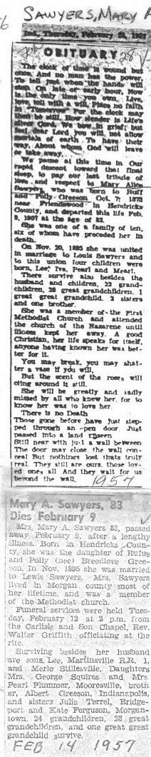 Obituary Source Mooresville Times, Feb. 14, 1957