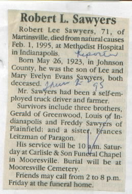 | Survived By | 3 brothers, Gerald, Louis, and Freddy Sawyers; sister, Frances Leitzman of Paragon. |