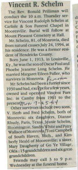 | Other | Age 81. Carlisle Chapel (Rev. Ronald Prilliman.) Buried Mt. Pleasant cemetery at Hall. Parents: Oscar Paul and Phoebe Jeanette Long Schelm. Furrier since 1930; owned and operated Vincent Furs on State Road 67. |