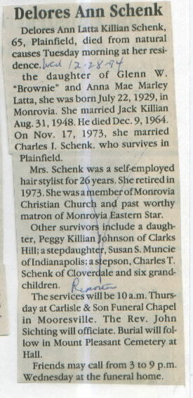 | Survived By | Husband; daughter, Peggy Killian Johnson of Clarks Hill; stepdaughter, Susan B. Muncie of Indianapolis; stepson, Charles T. Schenk of Cloverdale; 6 grandchildren. |