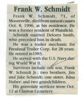 | Survived By | Son, Frank W. Schmidt, Jr.; 2 brothers, Jim and Jake Schmidt; sister, Edna Huber; 2 grandchildren. |