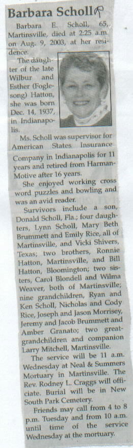 | Survived By | Son, Donald Scholl; 4 daughters, Lynn Scholl, Mary Beth Brummett, Emily Rice, and Vicki Shivers; 2 brothers, Ronnie and Bill Hatton; 2 sisters, Carol Blondell and Wilma Weaver; 9 grandchildren, Ryan and Ken Scholl, Nicholas and Cody Rice, Joseph and Jason Morrisey, Jeremy and Jacob Brummet, and Amber Granato; 2 great-grandchildren; companion, Larry Mitchell. |